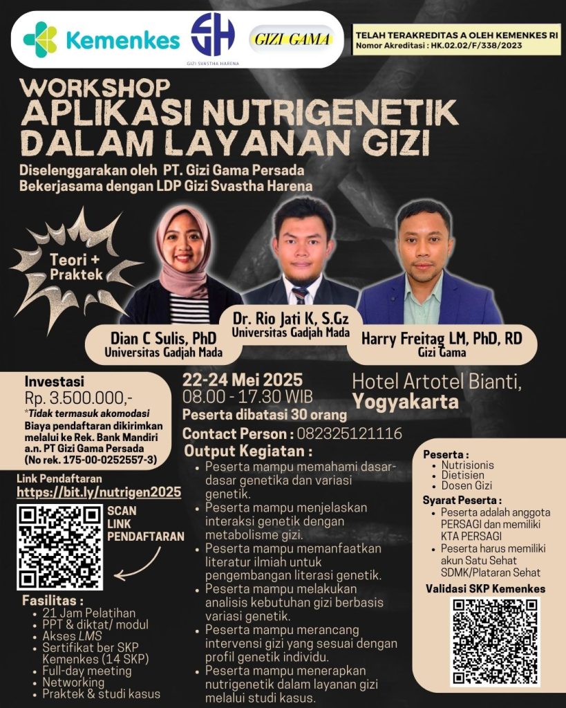 Workshop ini dirancang untuk membekali para peserta dengan pemahaman mendalam tentang dasar-dasar genetika, metabolisme gizi, hingga aplikasi praktis nutrigenetik dalam perancangan intervensi gizi. Dengan pendekatan teori dan praktek, peserta diharapkan dapat mengadopsi nutrigenetik sebagai bagian dari strategi pelayanan gizi yang lebih efektif dan berbasis bukti.