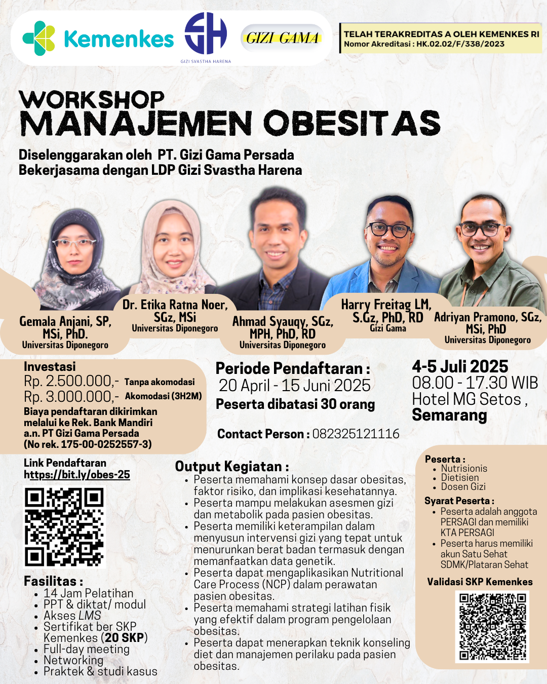 Dengan menghadirkan para pakar di bidang gizi dan metabolisme, workshop ini diharapkan dapat meningkatkan kompetensi peserta dalam menangani obesitas secara lebih efektif dan berbasis bukti ilmiah. Melalui sesi teori dan praktik yang interaktif, peserta akan memperoleh keterampilan aplikatif yang dapat langsung diterapkan dalam praktik profesional mereka.
